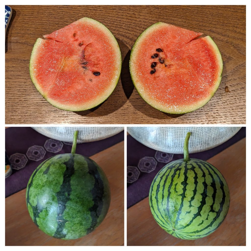 初夏の頃食した小玉スイカの種を撒いておいたら、一つ実がつきソフトボール大に育ちました。先日収穫して、中が青かったらお漬物にでも、と思って切ったところ!何と小さいながらも甘くて美味しく熟しておりました😆